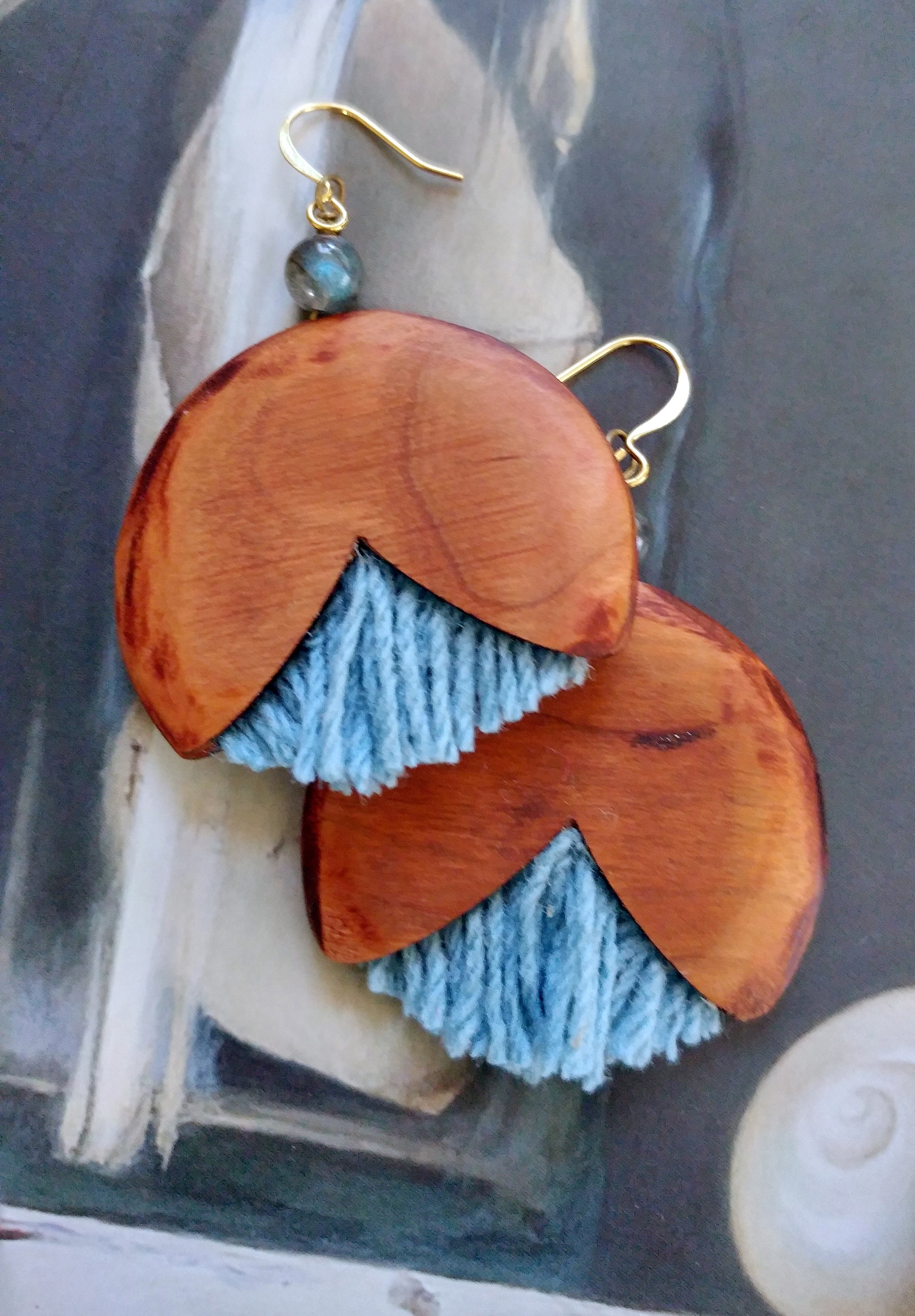 Delicate cherry pockets envelop a row of wool fringe. A single piece of labradorite accents the top. This handcrafted design features gold plated ear wires. A substantial statement earring that is surprisingly lightweight.